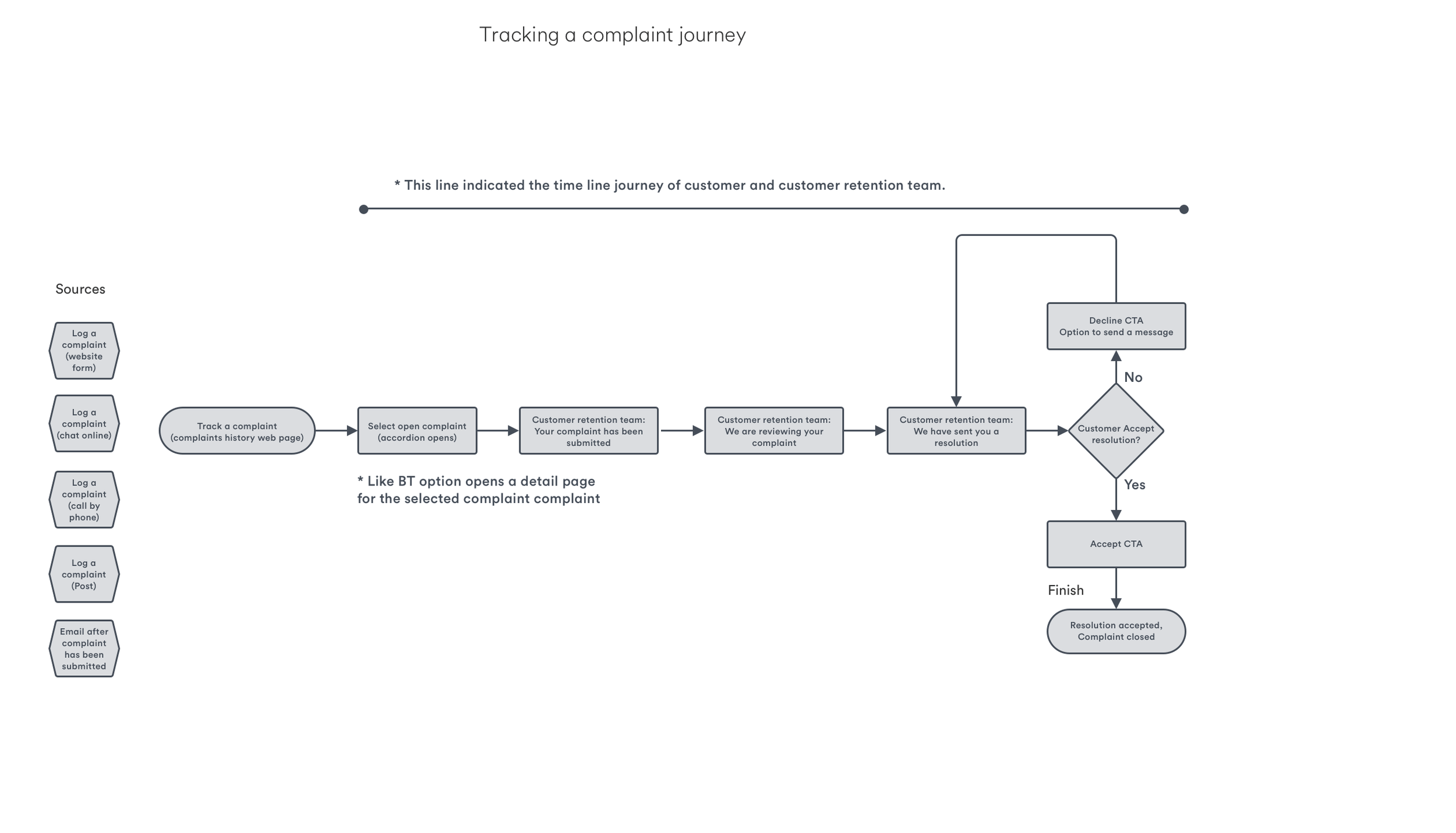 As part of the Discovery phase, we looked at competitors such as BT to see some of their successful features regarding tracking a complaint. To do this thoroughly, I signed up with BT for Broadband , tracked a complaint and documented the process.