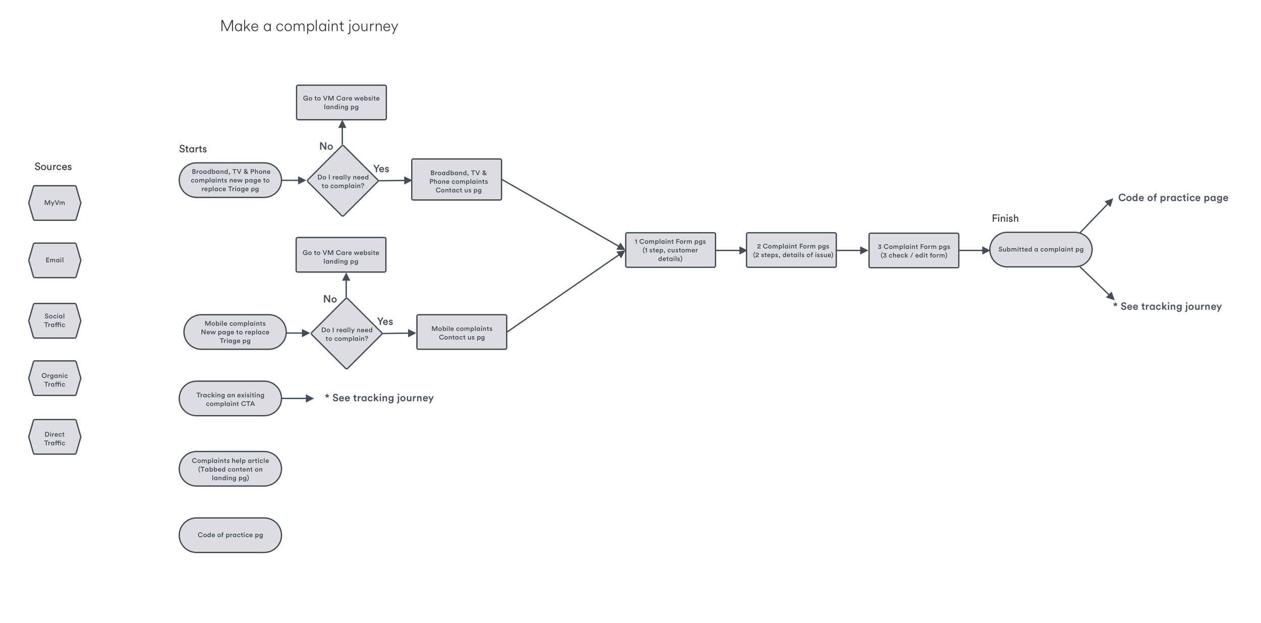 These are the proposed user flow diagrams for the complaints journeys on the Virgin Media Care website (Help Website). Please note some changes were updated later on after UserZoom Invision prototype testing, E.g. the Triage page was scrapped due to customers being confused in testing.